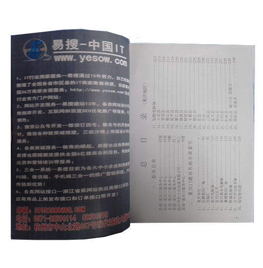 另外,书的封面右上角特别开发了手机二维码扫描功能,喜欢使用手机的朋友只要用微信扫一扫,就可以直接访问易搜网络平台(http://cq.yesow.com/),随时了解易搜最新动态和全国最新IT资讯!这本通讯录集结了我们全体员工的心血,精心,精诚,准确是我们的宗旨,对我们全体员工来说也是意义深刻,十年来,无数IT商家从易搜找到客户,我们也更努力,与您一同进步,如果您是重庆的IT商家,那就赶快行动起来吧,或许下一个你的客户就在这本书中。