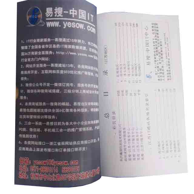 易搜-中国IT全面推出全国各地的IT行业通讯录工具书,此书分为全国各地31个省(每省1本)的IT商家和IT企业信息汇编而成!此书包括了IT行业电脑整机及PC配件、网络耗材、周边设备、办公设备、办公耗材、条码设备、安防设备、监控器材、数码周边、电子元件、手机及配件、电玩设备、系统工程、 包装印刷、IT维修保养、各大银行和政府采购机构的所有信息!